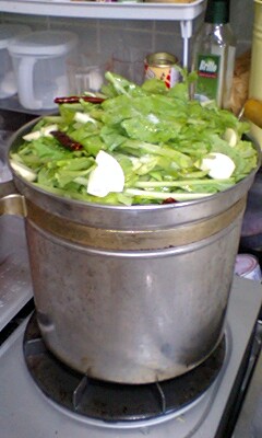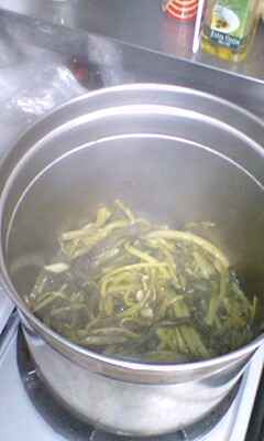 写真は大根菜をざくざく切って、お鍋に入れたところ。結構深いお鍋なのに、溢れんばかりです。にんにく、鷹の爪、塩、オリーブ油を振り掛けてことこと煮込むだけ。オリーブ油とにんにくの組み合わせで、美味しくないはずが無いのです。
