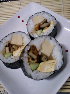 具材は高野豆腐、かんぴょう、しいたけ、卵、穴子、きゅうりの六種。一種類足りませんが、そこはご勘弁。何せ思いつきですから。若干濃い目に味付けた具材を巻くのですが、どうしてなかなか、難しいものですね…;何本も巻いたものの結局成功したのは最後の一本だけでした。とほー。