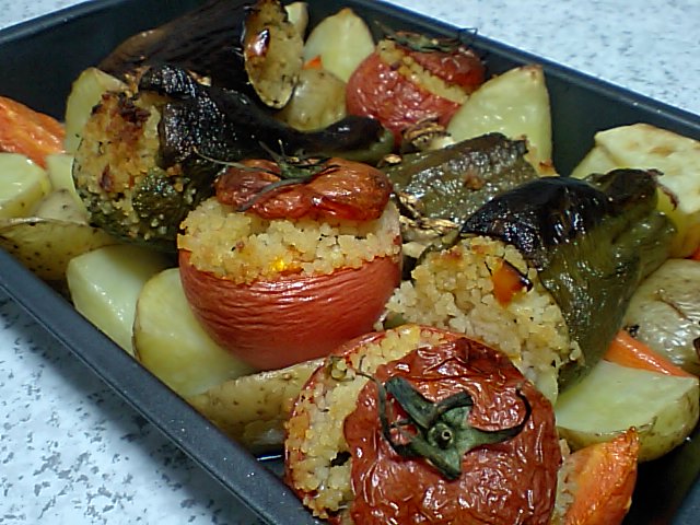 そして、久々の料理はこちら。トマト、ピーマン、ナスをくり抜いたものに、ツナなどで味付けしたクスクスを詰めてオーブンで焼き上げました。